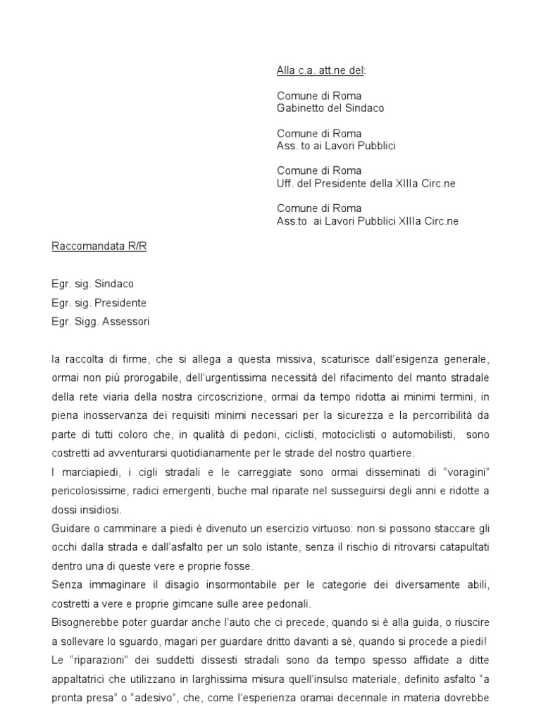 Lettera al Comune per Strada Dissestata - Come Scrivere, Esempio ... Il fac simile lettera al comune per strada dissestata presente è messo a disposizione in formato DOC, questo significa che il modulo può essere aperto e modificato utilizzando Word, per compilare la lettera inserendo i dati mancanti come spiegato in precedenza. Trattandosi di un fac simile editabile, la lettera al comune per strada dissestata ...