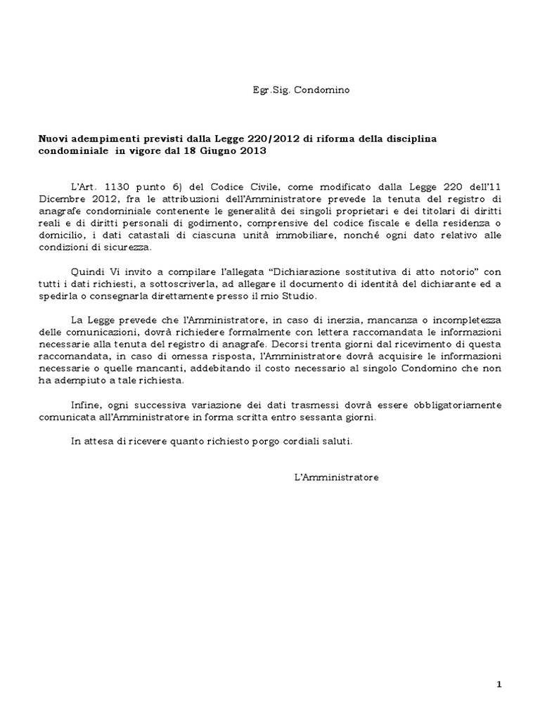 Lettera amministratore condominio fac simile