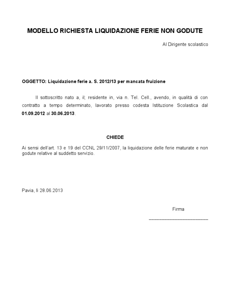 Modello FLC CGIL richiesta pagamento ferie Modello FLC CGIL richiesta pagamento ferie. Scarica il documento · Invia ad un amico. Stampa. Tag: dl 95/12, governo, legge 440/97, mario monti, miur, ... Mod. richiesta ferie non godute Jun 9, 2020 ... modello richiesta-pagamento-ferie (25 kB). 09.06.2020. Pubblicato il 9 Giugno 2020 da Alfonso Ingegno Contenuto in: Modulistica ... MODELLO RICHIESTA LIQUIDAZIONE FERIE NON GODUTE. 13 e. 19 del CCNL. 29/11/2007, la liquidazione delle. 5 / 9. Page 6. MODELLO RICHIESTA LIQUIDAZIONE FERIE NON GODUTE. ferie maturate e non godute relative al.